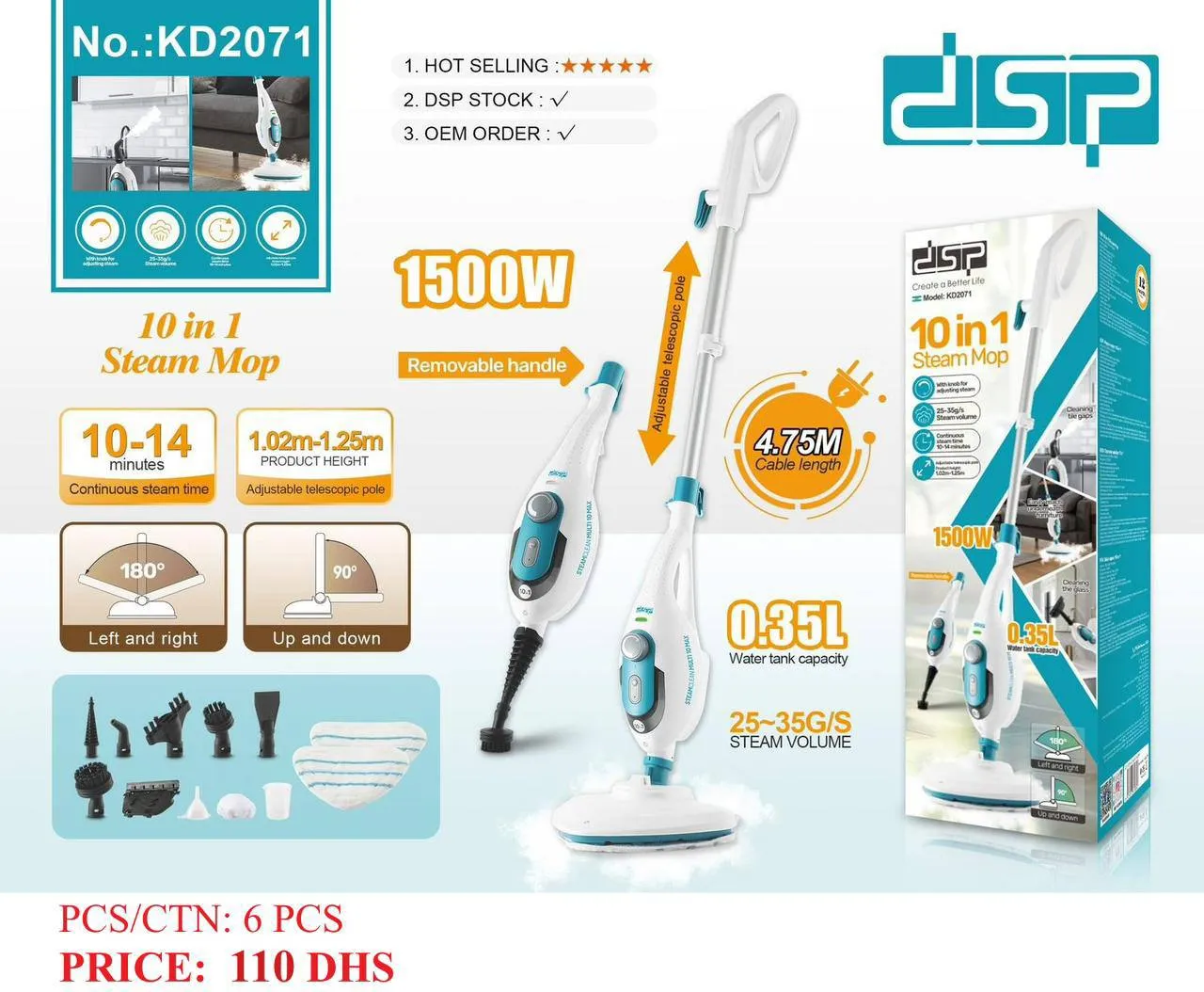 بخارشو ۱۰ کاره دی اس پی مدل KD2071 دستگاهی چندمنظوره برای تمیزی انواع سطوح داخل خانه است. این بخارشوی با عملکرد بخار قوی و طراحی ۱۰ کاره امکان استفاده از قطعات مختلف را برای چند کاربرد فراهم میکند. موتور و المنت حرارتی مناسب باعث میشود بخار با دمای کافی و پیوسته برای زدودن چربی، لکه و آلودگی سطوح تامین شود. دسته و بدنه دستگاه بهگونهای طراحی شده تا کنترل راحت و قابلاعتماد در زمان استفاده داشته باشید. مجموعه سریهای همراه دستگاه به شما کمک میکند که کفپوشها، سرامیک، شیشه، فرش و درزها را بهراحتی تمیز کنید.